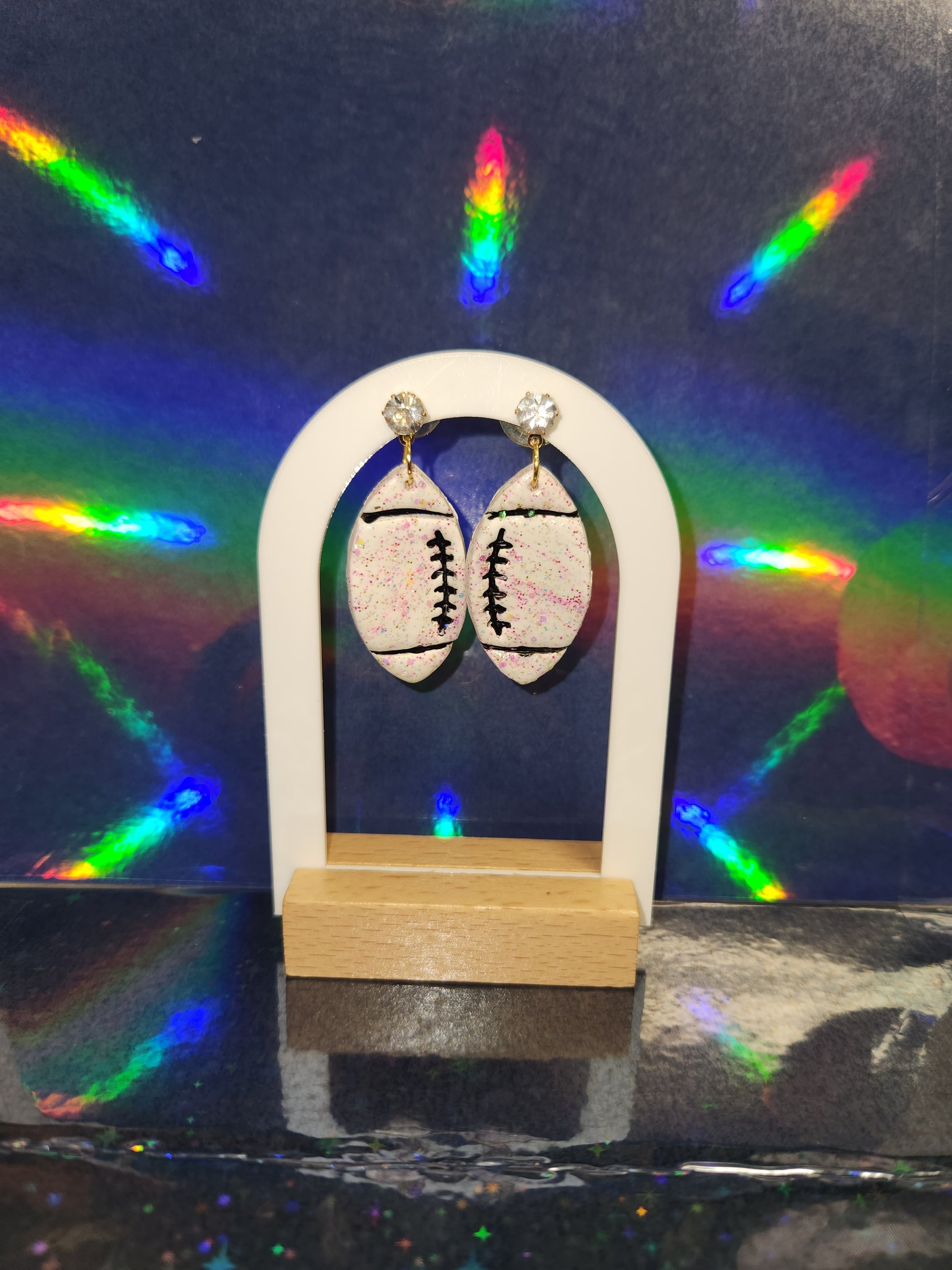 White and black sparkle football clay earrings with “diamond stud “ fasteners handmade from polymer clay