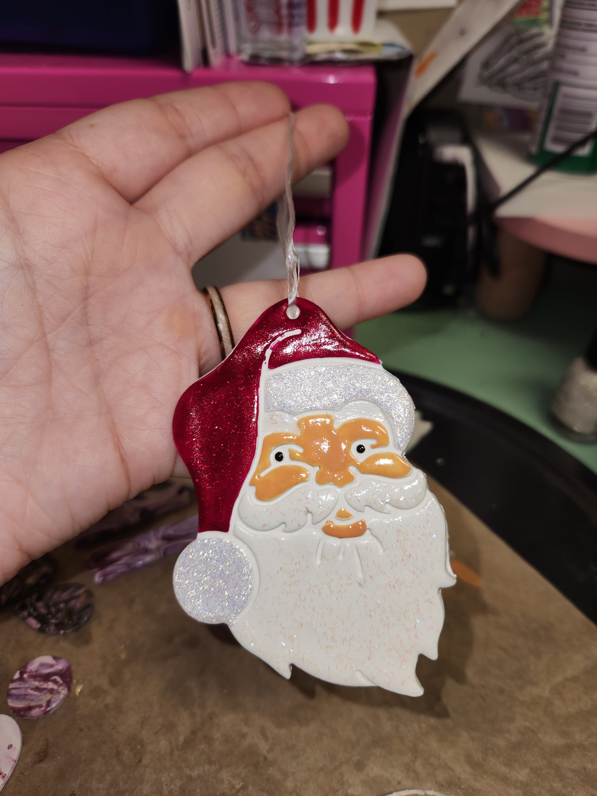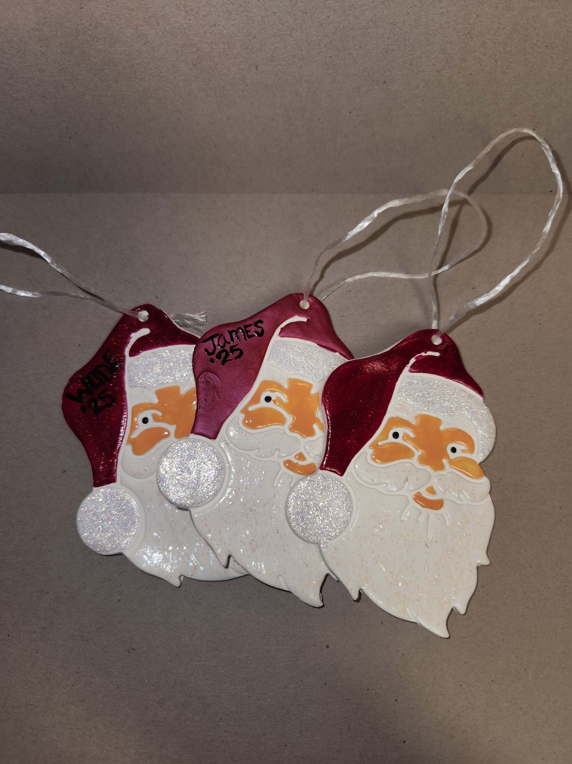 Santa Clause Ornament hand made with polymer clay and painted. These can be personalized with names and dates if wanted or can be non-painted for you or your littles to paint.